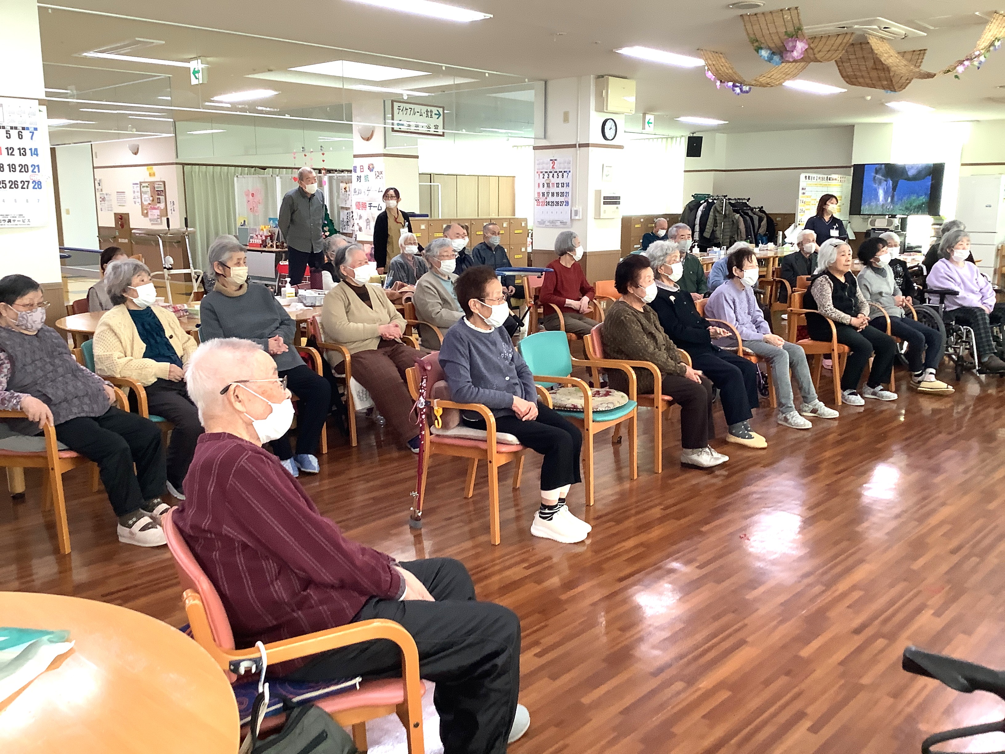 お寿司レク&ボランティアさん(函館民謡愛好会) 昼食は出前のお寿司を堪能し、みなさんの笑顔が広がりました🍣😋 食後には函館民謡愛好会のみなさまをお招きし、民謡や懐かしの曲を披露していただきました🪕🎵 心地よい歌声と演奏に包まれ、口も鼻も目も耳も満たされる、贅沢で温かなひとときとなりました💖