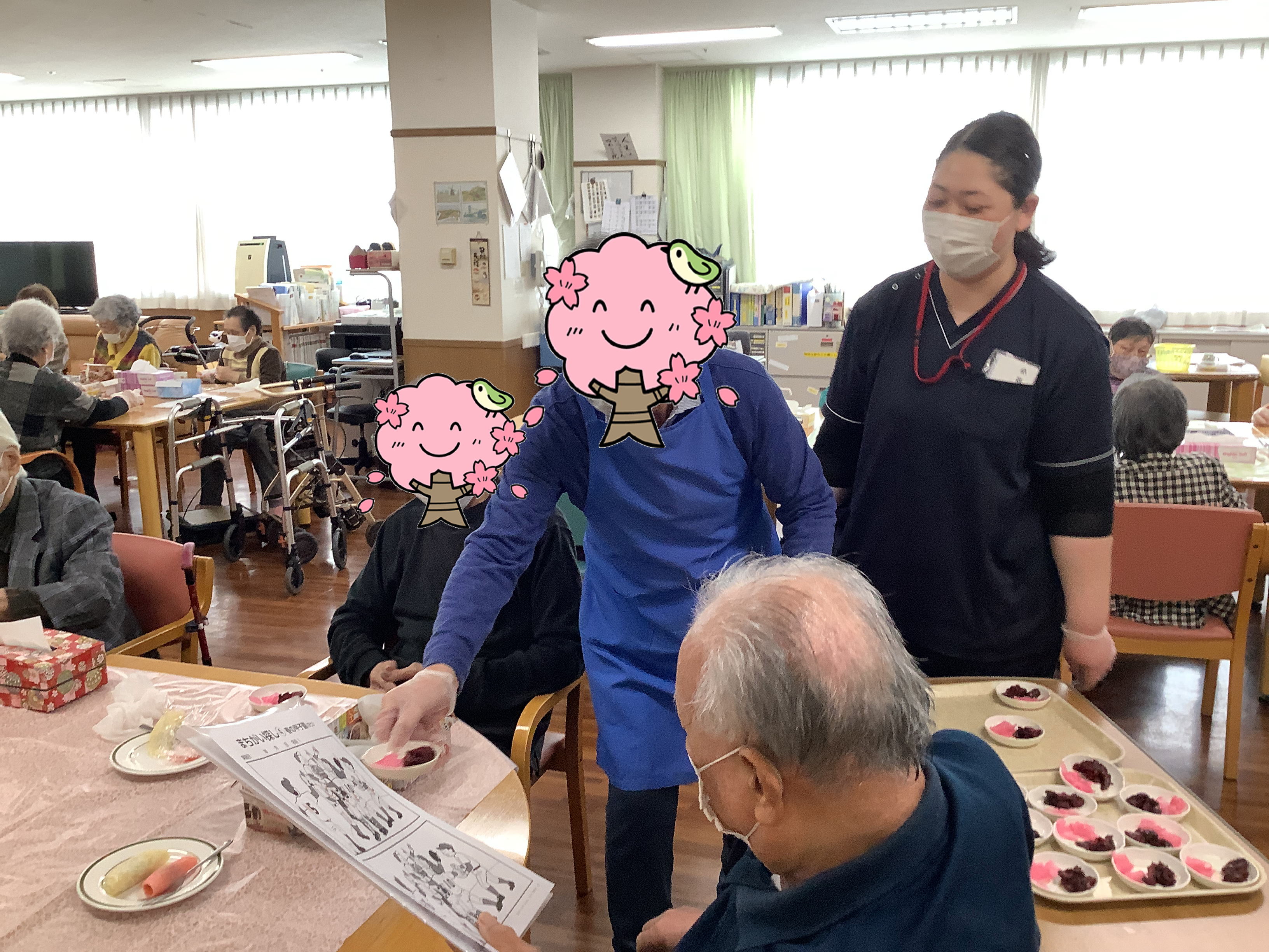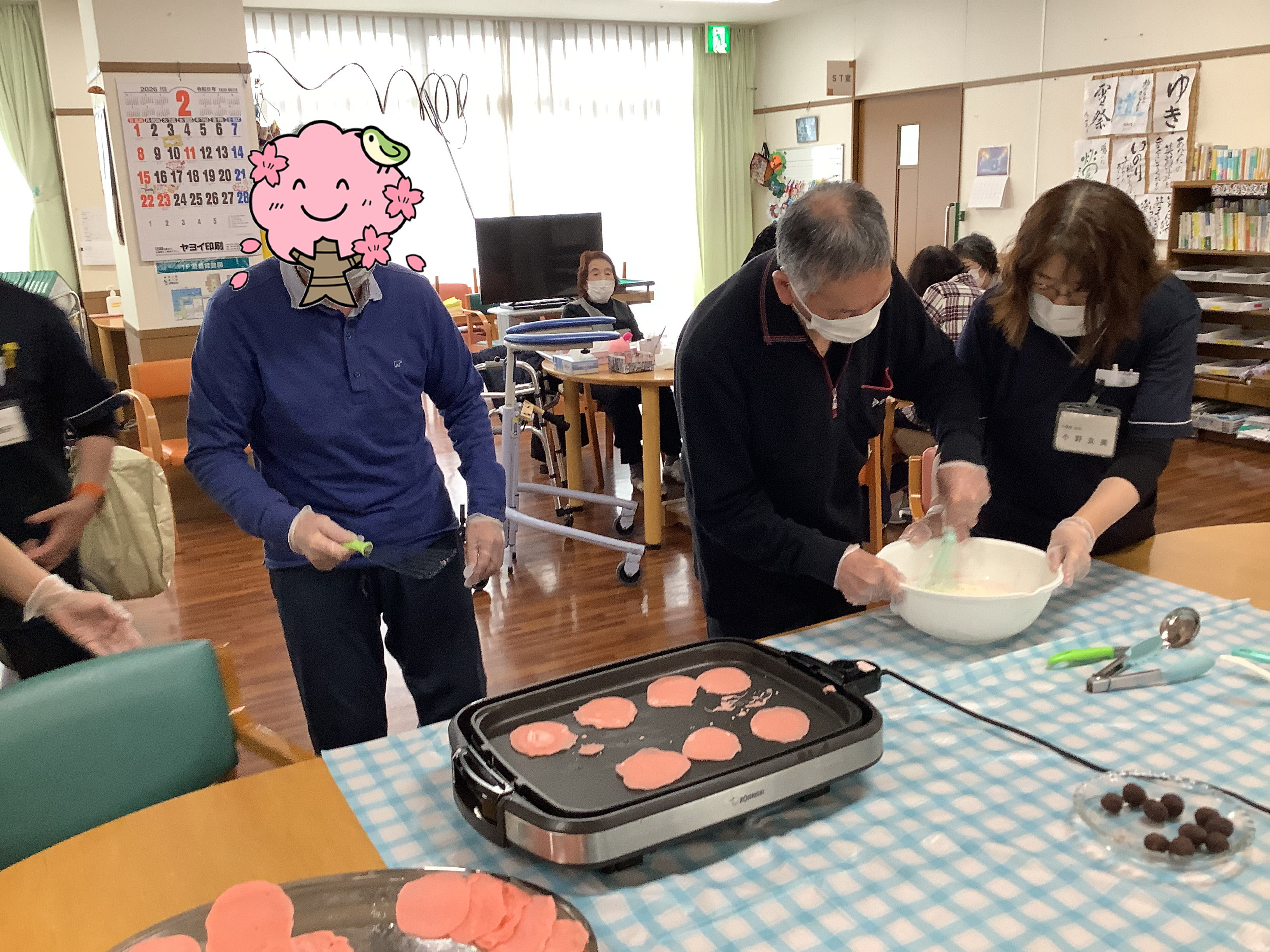 おだまき作り 生地を焼いてあんこを包む「おだまき」作りをおこないました🧑🏻🍳 生地を焼き、あんこを丸め、くばって味わってと大忙しでしたが、その分できたての甘いあんこは格別で、利用者のみなさんからも「おいしい!」と大好評でした😋 男性利用者さんも大活躍です👨🏻🍳 手作りならではの温かさに、笑顔が広がる時間となりました🍵😊