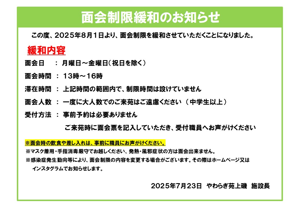 面会制限緩和のお知らせ やわらぎ苑上磯(入所)の面会制限につきまして、8月1日より次の通り緩和させていただくことになりましたので、お知らせいたします。 ご不明な点はやわらぎ苑上磯(0138-49-8080)までお問合せ下さい。